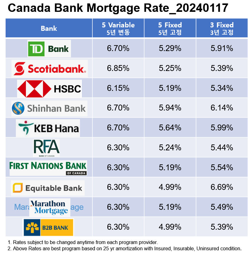 | 캐나다 TD, RBC, BMO, CIBC, Scotia 은행 모기지 이율 이자 정보 24년 1월 2일 기준 (1) | 2024.01.03 |
